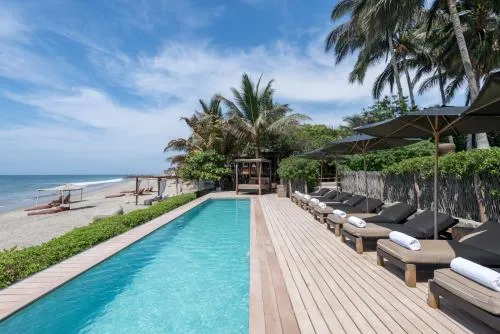 Construit avec des matériaux naturels et durables comme l'adobe, le bois d'eucalyptus et la pierre, cet hôtel est conçu pour être en harmonie avec le paysage de la plage. Il dispose d'un jardin potager biologique et utilise des produits de bain écologiques. L'hôtel s'approvisionne en ingrédients auprès des agriculteurs et pêcheurs locaux.